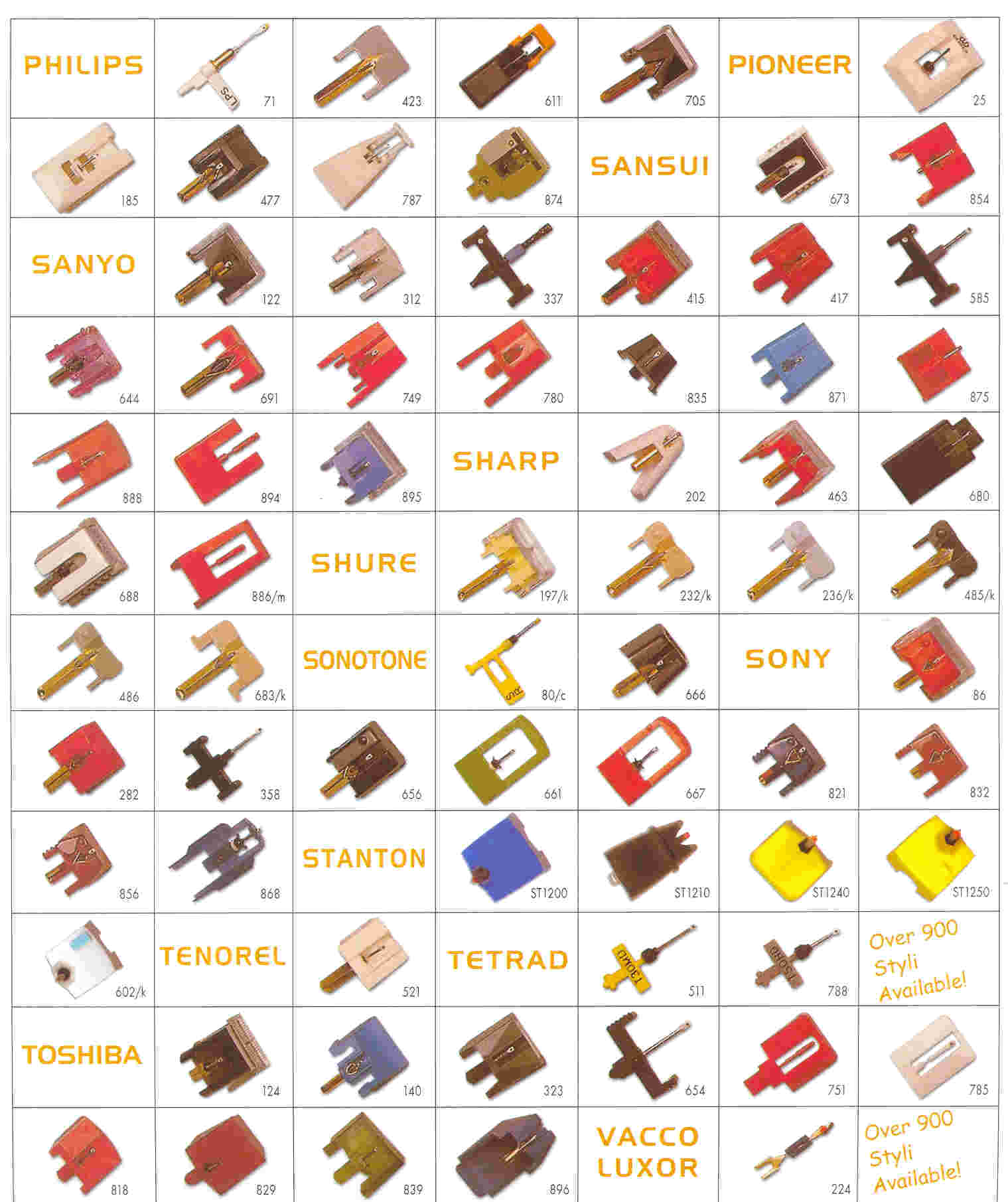 Below are pictures of just a few of the over 900 styli that we used to supply. Regretably our supplier has gone out of business so we can no longer assist with stylus enquiries. Click here for contact details.
